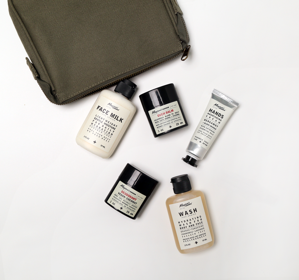 This amazing kit is ready to fly the skies or hit the road. Elevate your travels and mood with these skincare essentials. Our best selling skincare products and remedies all in non-breakable packaging, TSA approved sizes, and housed in a utilitarian travel bag with a distressed hardy zipper and a waterproof interior.